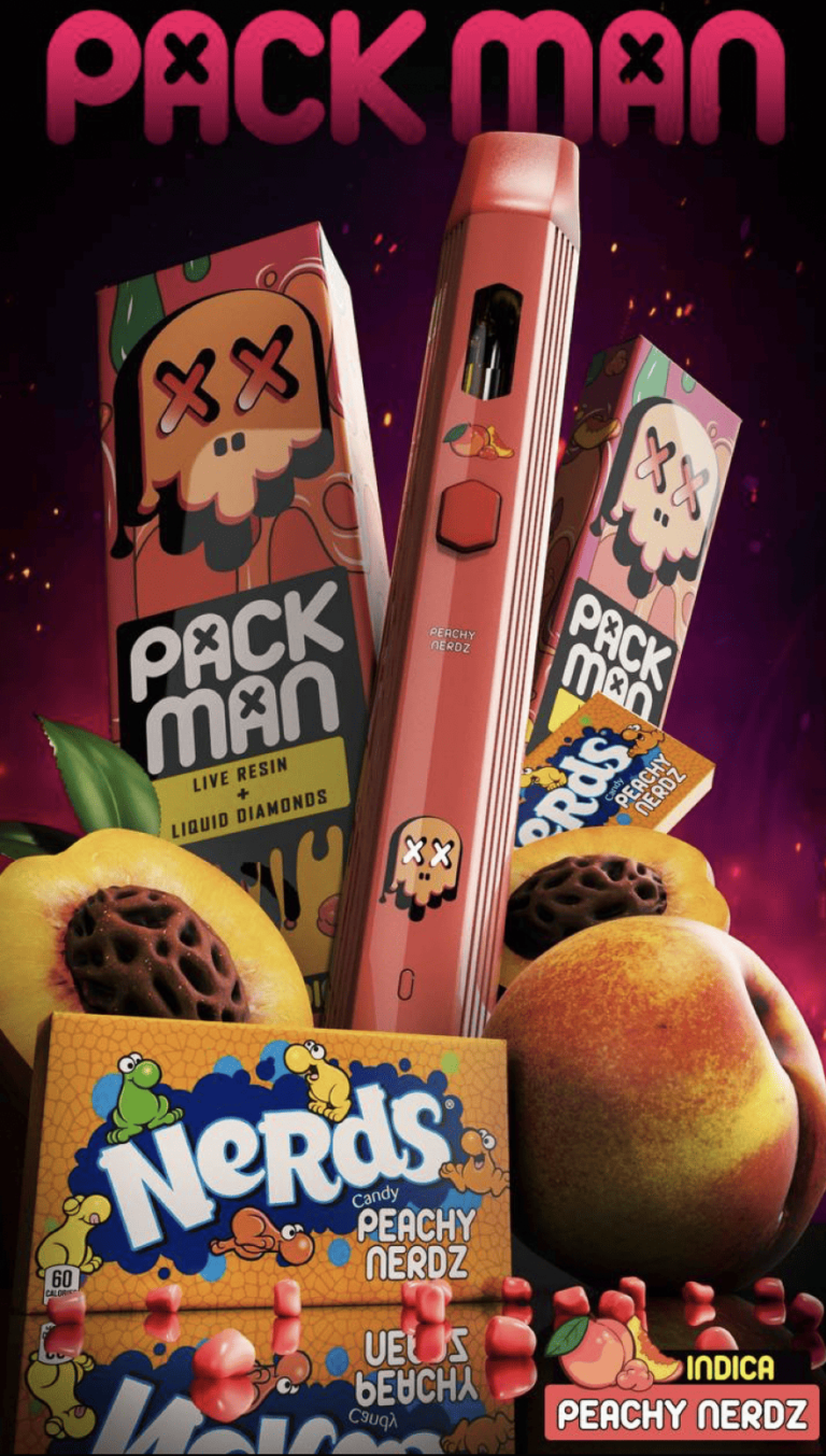 PackMan dispos Peachy Nerdz, You can taste the explosion by saying the name. Fruit candy and gas manifest into this mouth-watering bold blend. A strong indica blend that will knock you on your ass and have you on a couch lock. Peach cobbler dessert mixed with peach rings and nerdz candy with cannabis undertones subtly dominating. This profile will not be taken lightly and will be smoked for those with no plans over the next few hours. Working or being in a creative space will be difficult. Through hints of floral and candy, it is no question it will be your very own dessert for when the day is done.